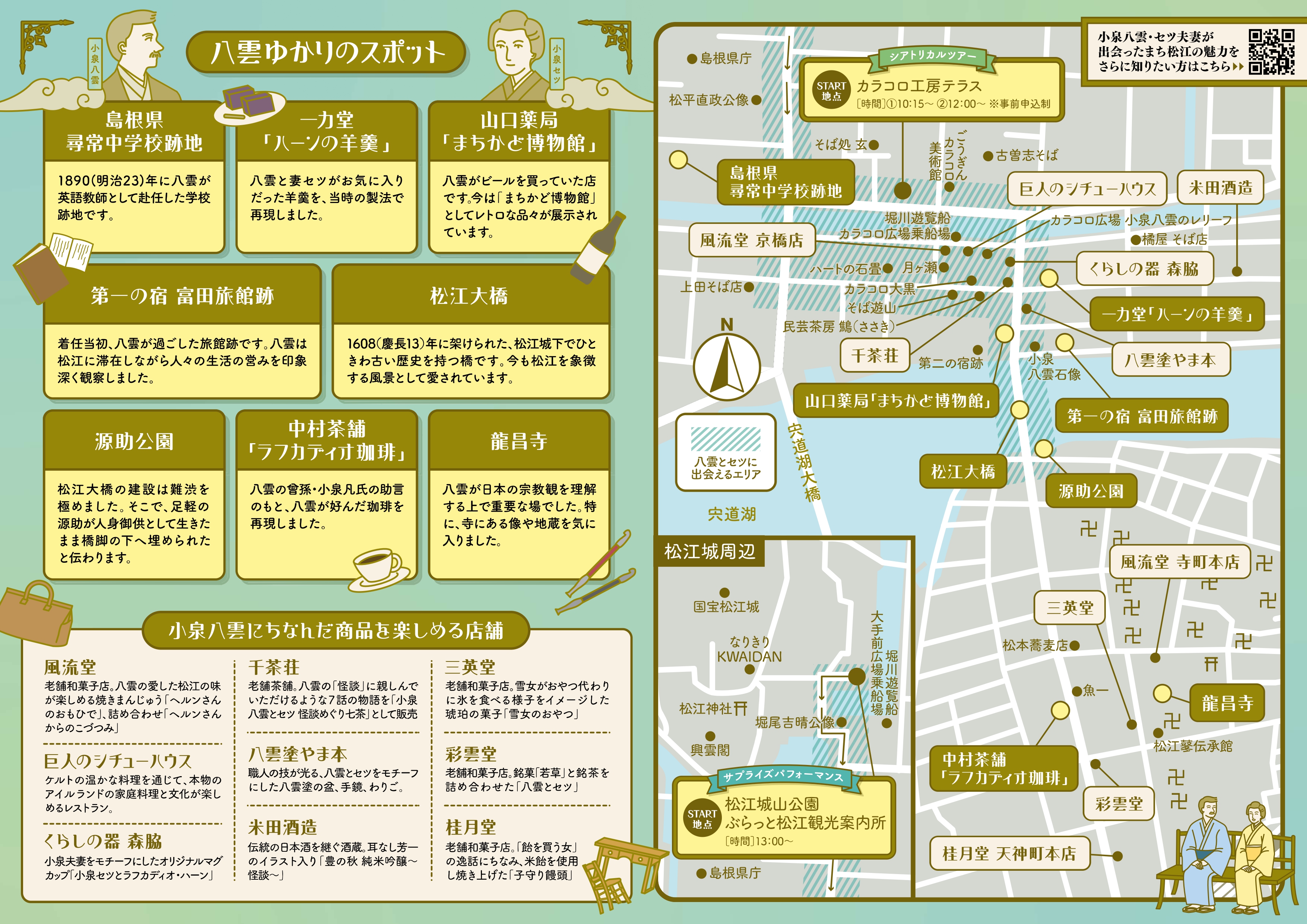 ※小泉八雲、セツがタイムトラベラーと共に、13時に出発地から松江中心部(地図上の「八雲とセツに出会えるエリア」)へと向かいます。