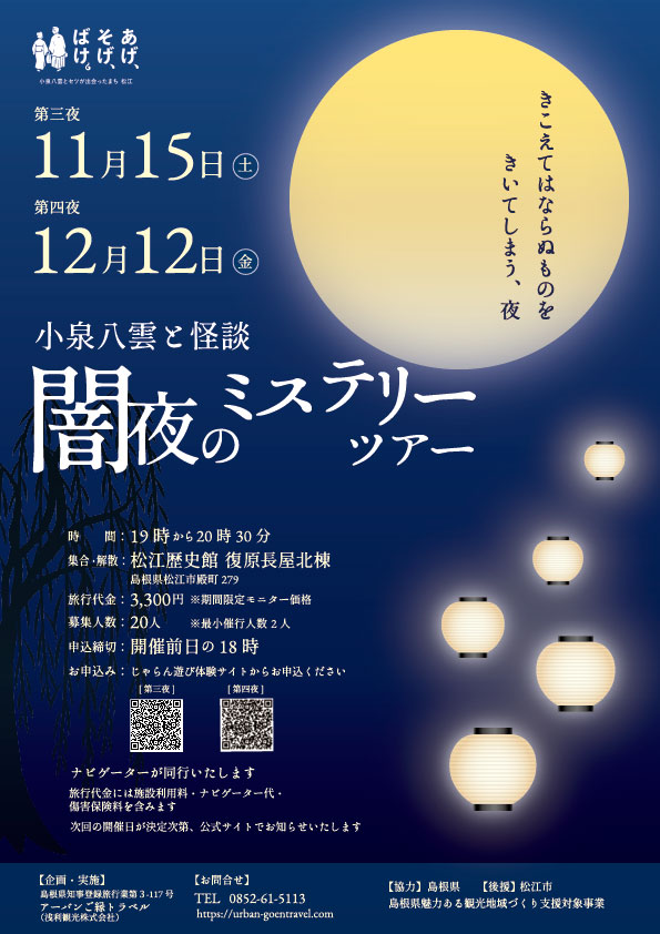 明治の文豪・小泉八雲の幻想的な怪談をもとに、夜の松江を舞台にした体験型ツアー「闇夜のミステリーツアー」を期間限定の特別価格で開催します。